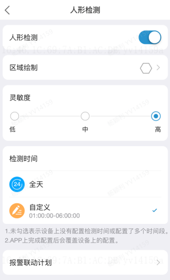 ·打开告警开关,配置告警区域,选择合适的灵敏度,选择合适的抓拍目标,根据需求选择是否要配置。