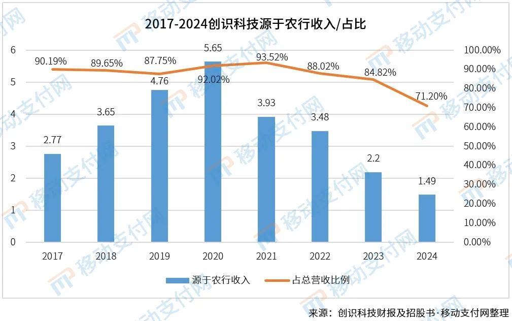 数据显示,创识科技业务高度依赖农行渠道。创识科技在此前的财报中也表示,与农行的合作已经超过二十余年,双方信任度较高、粘性较强。据移动支付网了解,自创识科技成立以来,基本每年都与农行有重大合作。